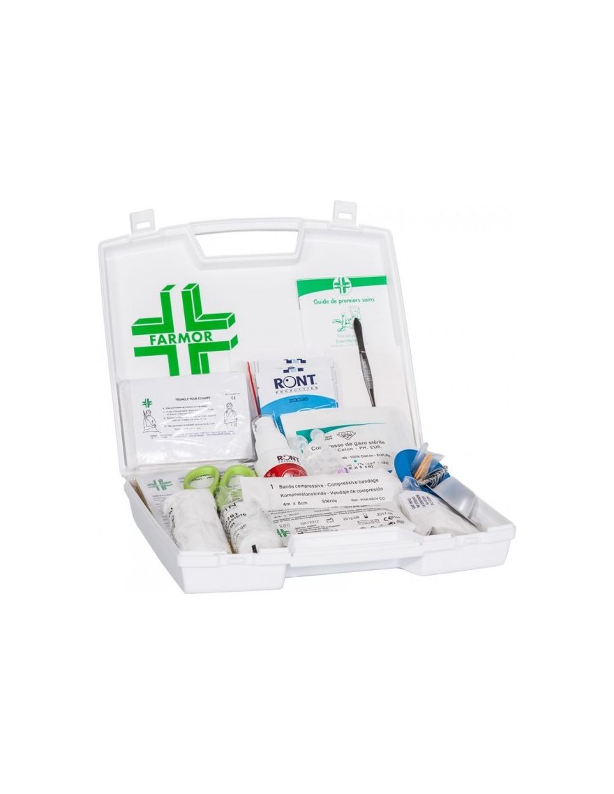 Coffret en polypro Blanc. Dimensions : 23 x 17 x 5 cm Composition de la recharge : 1 Couverture de survie, 10 Compresses stériles 20 x 20 cm, 2 Bandes extensibles en 3 m x 7 cm, 1 Rouleau de sparadrap en 5 m, 6 Pansements adhésifs 2 x 6 cm, 6 Pansements adhésifs 4 x 6 cm, 6 Pansements adhésifs 10 x 6 cm, 1 Pansement compressif stérile 2,5 m x 6 cm, 1 Pansement compressif stérile 2,5 m x 10 cm, 5 Compresses alcoolisées, 5 Compresses antiseptiques, 2 Unidoses 5 ml pour lavages oculaires, 1 Paire de ciseaux, 1 Pince à échardes, 1 Doigtier, 2 Paires de gants vinyle, 1 Guide de premiers secours en 6 langues.